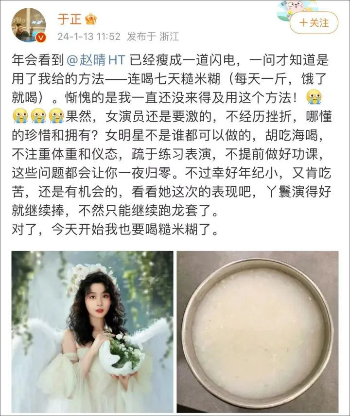 于正曾发微博称:“年会看到赵晴已经瘦成一道闪电,一问才知道是用了我给的方法——连喝七天糙米糊(每天一斤,饿了就喝)。果然,女演员还是要激的,不经历挫折,哪懂的珍惜和拥有?女明星不是谁都可以做的,胡吃海喝,不注重体重和仪态,疏于练习表演,不提前做好功课,这些问题都会让你一夜归零。看看她这次的表现吧,丫鬟演得好就继续捧,不然只能继续跑龙套了。”