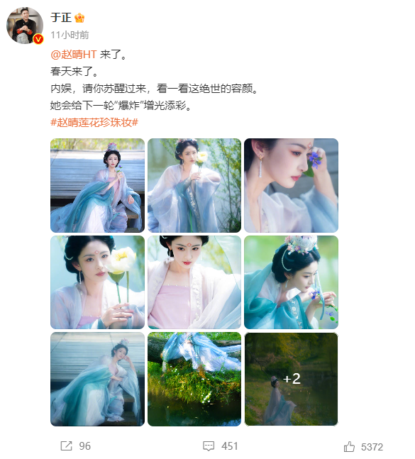3月26日,于正发文为赵晴打call:内娱,请你苏醒过来,看一看这绝世的容颜。她会给下一轮“爆炸”增光添彩。